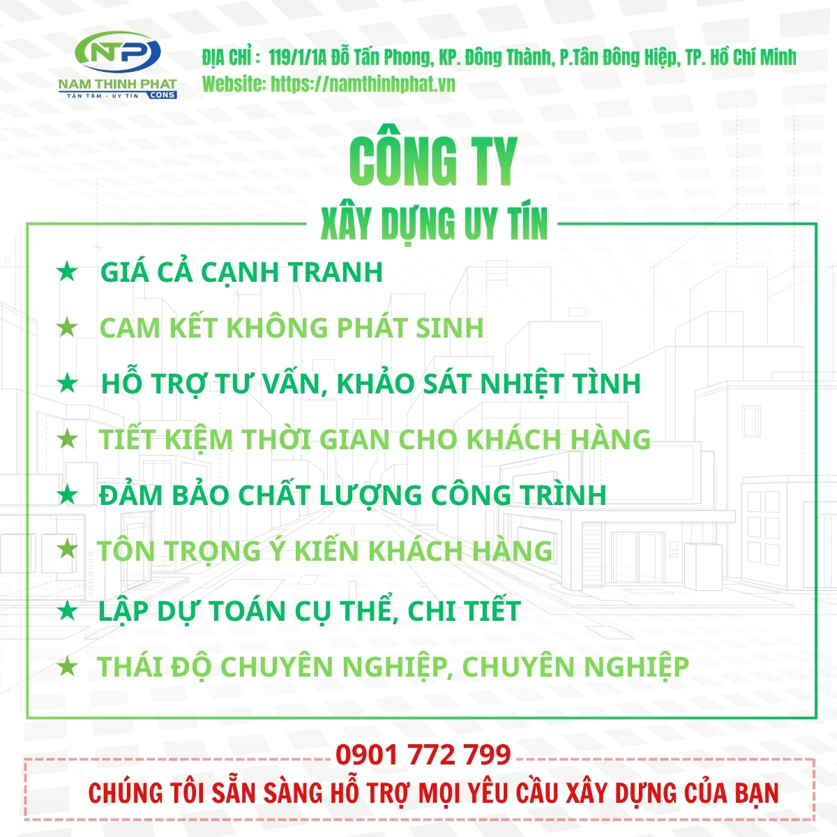 Nam Thịnh Phát cam kết đồng hành cùng khách hàng trong suốt quá trình xây dựng – từ khâu lập kế hoạch, thi công cho đến bảo trì lâu dài – để hiện thực hóa giấc mơ về một ngôi nhà hoàn hảo.