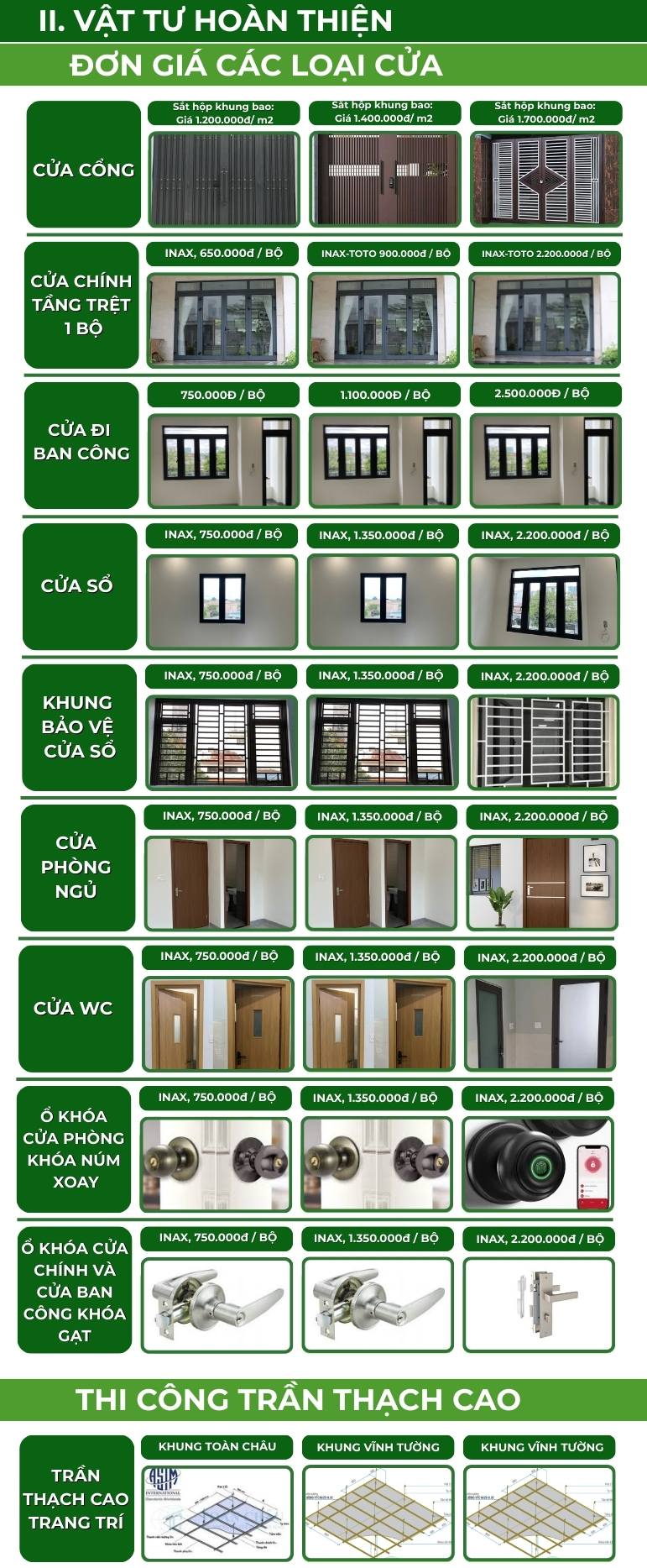- Đơn giá xây nhà trọn gói trên tính cho nhà có diện tích > 60m2/sàn, và tổng diện tích m2 xây dựng > 250m2.