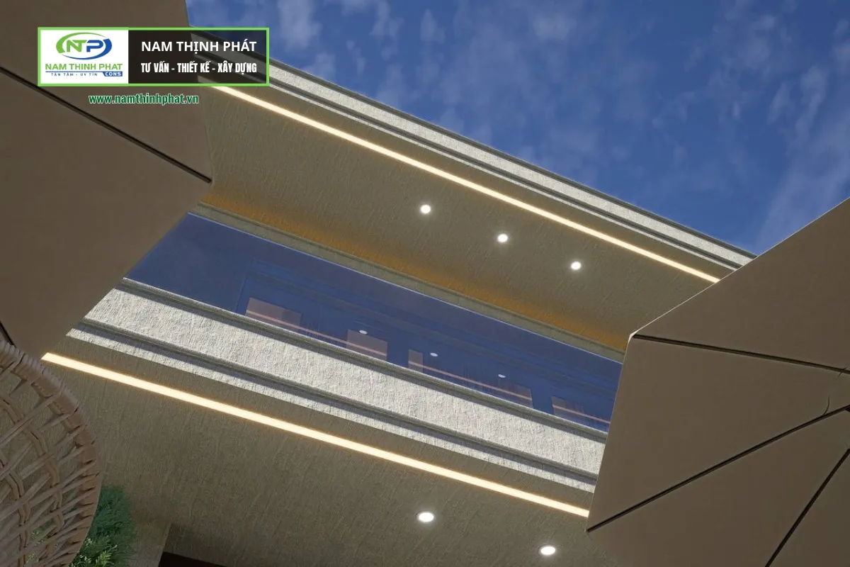 - Điểm nhấn của công trình là hệ mái bằng kết hợp dải đèn LED chạy quanh các mép sàn, tạo hiệu ứng ánh sáng lung linh khi về đêm. Đây là chi tiết thường thấy trong những biệt thự cao cấp, vừa tăng tính thẩm mỹ vừa nâng tầm giá trị kiến trúc.