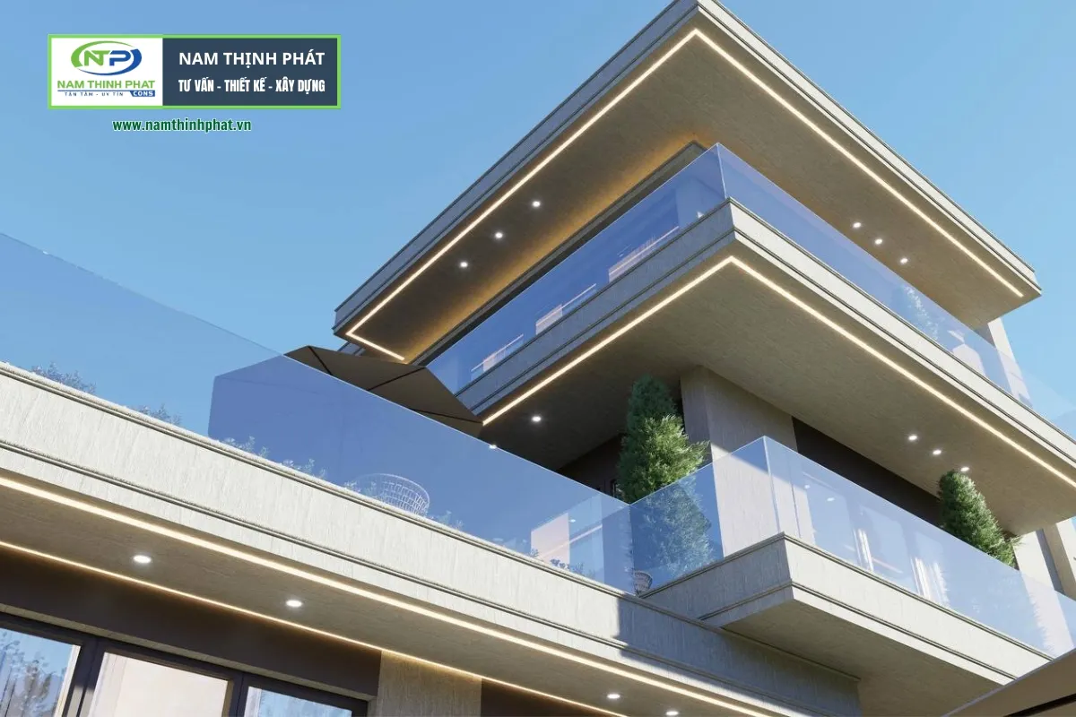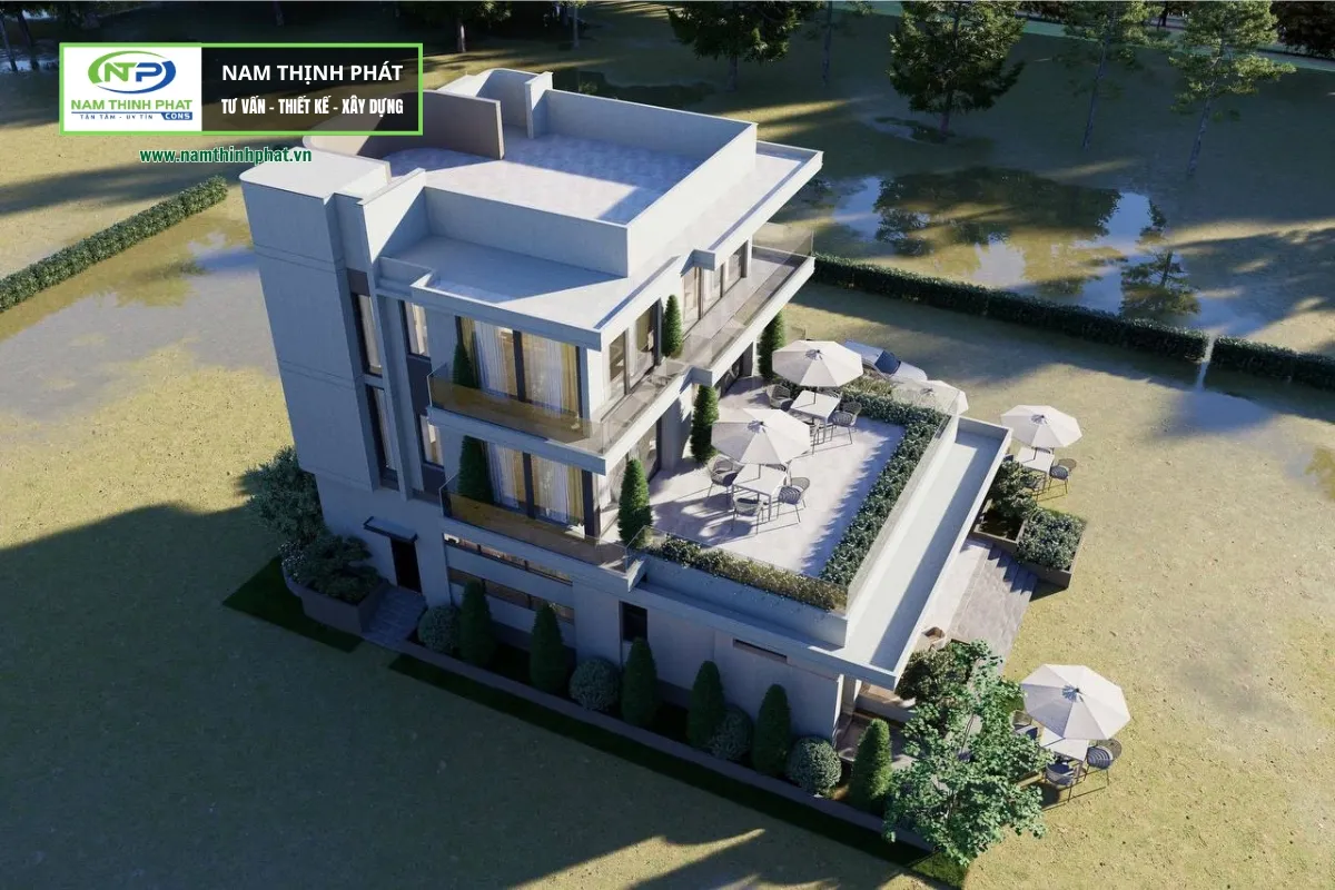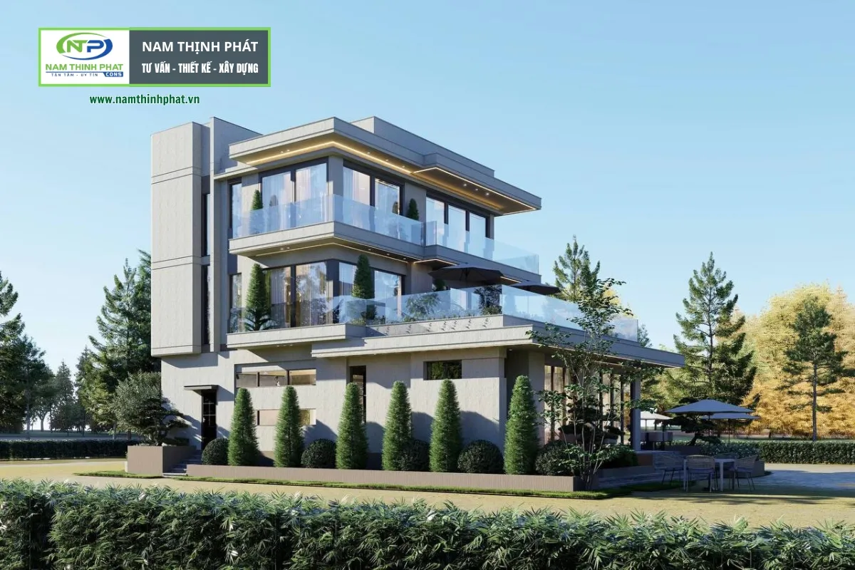 Biệt thự vườn 2 tầng hiện đại đang là xu hướng thiết kế hiện nay, nó vừa hiện đại, vừa mang vẻ đẹp sang trọng nhưng vẫn gần gũi với thiên nhiên, lý tưởng cho những gia chủ yêu thích không gian sống nghỉ dưỡng mỗi ngày. Khối nhà được tổ chức theo các đường ngang mạnh mẽ, kết hợp kính cường lực và những mảng tường phẳng màu trung tính, tạo nên tổng thể kiến trúc trẻ trung, thanh thoát. Hệ ban công rộng, lan can kính trong suốt mở trọn tầm nhìn ra khu vườn và hồ nước xung quanh, giúp ánh sáng tự nhiên tràn ngập mọi không gian. Nếu bạn đang tìm đơn vị thiết kế thi công biệt thự trọn gói, tham khảo ngay mẫu biệt thự sau đây và chúng tôi là Nam Thịnh Phát: chuyên xây biệt thư ở khu vực thành phố Hồ Chí Minh.