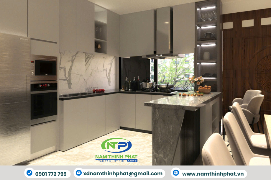 Không gian bếp là nơi gia đình anh Hùng dành nhiều thời gian để nấu nướng và liên quần bên nhau. Vì vậy, Nam Thịnh Phát đã thiết kế bếp với bố cục mở, tạo cảm giác thoáng đãng và dễ dàng chuyển tiếp. Tủ bếp hiện đại với nhiều ngăn chứa, kết hợp cùng các thiết bị bếp tiên tiến, mang đến sự tiện nghi tối đa cho việc nấu nướng. Bàn ăn được bố trí gần cửa sổ để tận dụng ánh sáng tự nhiên và tầm nhìn thoáng mát.