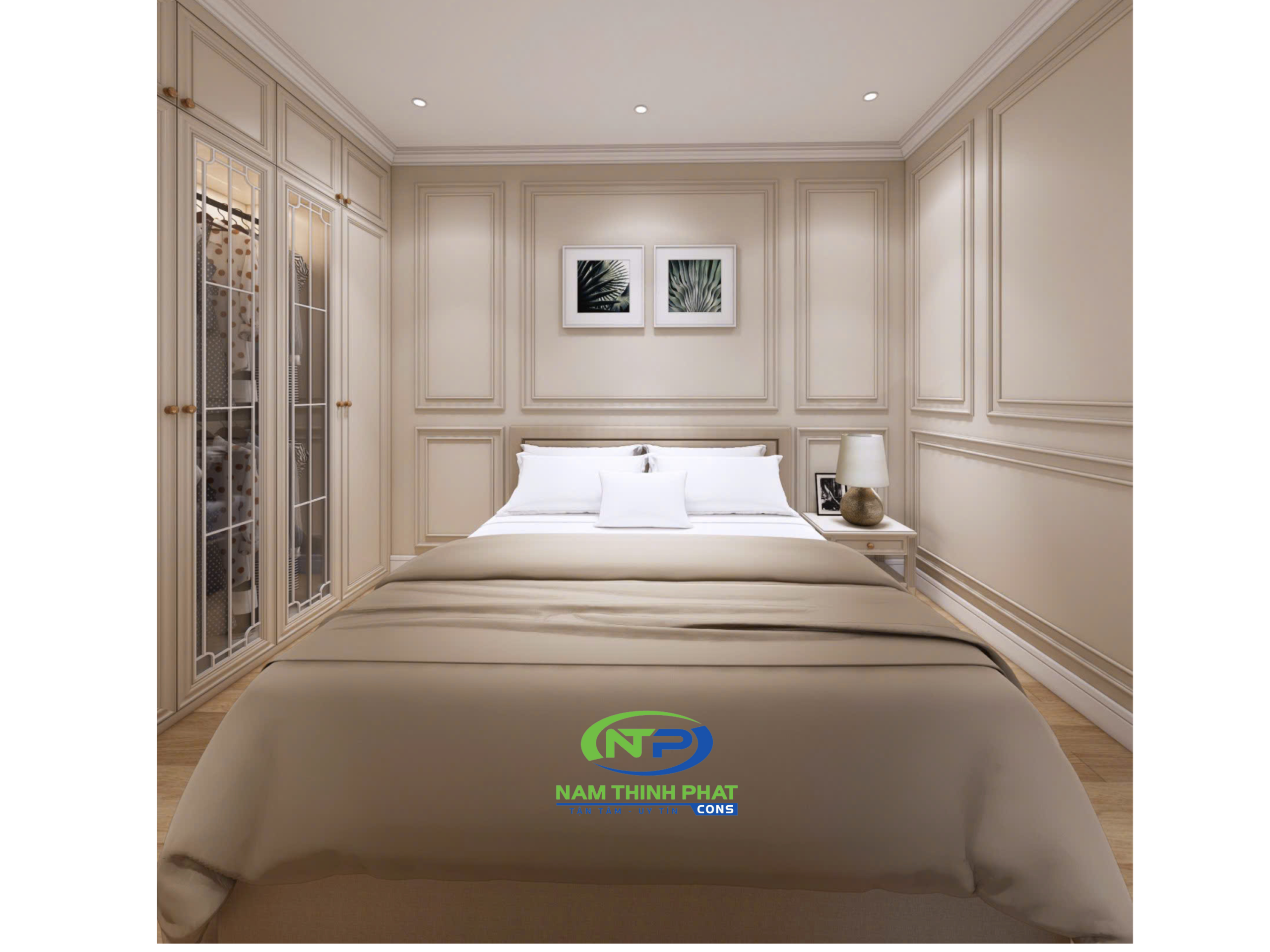 Phòng ngủ của căn hộ được thiết kế tối giản để mang lại sự yên bình và thư thái. Các món đồ nội thất như giường, tủ quần áo, và kệ trang trí được bố trí hợp lý, tạo nên không gian nghỉ ngơi tối ưu. Nam Thịnh Phát sử dụng các chất liệu cao cấp để đảm bảo độ bền và sự thoải mái thoải mái cho người sử dụng. Màu sắc phòng ngủ được chọn lọc kỹ càng, tạo cảm giác dễ chịu.