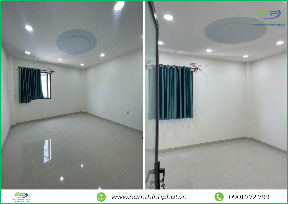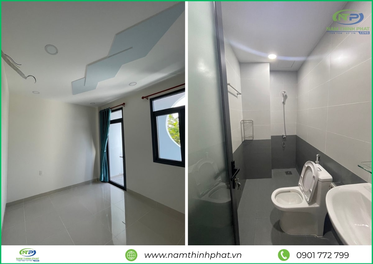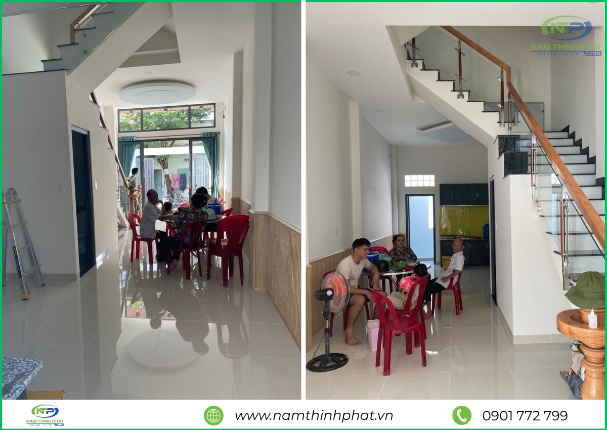 Trong giai đoạn hoàn thiện, đội ngũ Nam Thịnh Phát đã tiến hành thi công các hạng mục quan trọng như ốp lát gạch, sơn nước, lắp đặt cửa nhôm kính, hệ thống điện – nước âm tường, trần thạch cao và các chi tiết trang trí nội thất khác. Mọi công đoạn đều được thực hiện tỉ mỉ, đúng kỹ thuật, đảm bảo cả tính thẩm mỹ lẫn độ bền lâu dài cho công trình. Từ màu sơn, loại gạch, đến tay vịn cầu thang đều được lựa chọn kỹ lưỡng để hài hòa tổng thể kiến trúc và nâng tầm không gian sống. Nhờ sự chăm chút trong từng chi tiết, ngôi nhà 1 trệt 2 lầu Thủ Đức của anh Thảng sau khi hoàn thiện đã trở nên hiện đại, tiện nghi và bền vững, mang lại cảm giác thoải mái, an toàn cho cả gia đình.